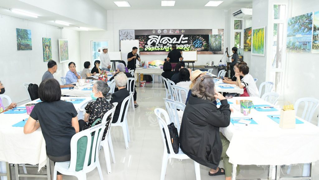 วันที่ 24 ม.ค. 69 เวลา 09.00 น. คณะมนุษยศาสตร์และสังคมศาสตร์ มหาวิทยาลัยราชภัฏราชนครินทร์จัดโครงการส่งเสริมและพัฒนาคุณภาพชีวิตของประชาชนทุกช่วงวัยให้มีสุขภาพดีทั้งสุขภาวะทางกาย จิตใจ สังคม และปัญญา หลักสูตร ศิลปะสำหรับผู้สูงอายุ ตามบันทึกข้อตกลงความร่วมมือระหว่างมหาวิทยาลัยราชภัฏราชนครินทร์ กับ ศูนย์พัฒนาคุณภาพชีวิตผู้สูงอายุและคนพิการเทศบาลเมืองฉะเชิงเทรา โดยมีอาจารย์ ดร.จินดา เนื่องจำนงค์ อาจารย์ประจำสาขาวิชาทัศนศิลป์และมิเดียอาร์ต พร้อมด้วยอาจารย์สหภพ ปานทอง ศิลปินอิสระ และอาจารย์ไชโย กุลวงค์ เป็นวิทยากร และการแนะนำหลักสูตรการทำผ้ามัดย้อมเบื้องต้น จากอาจารย์โยธิน จี้กังวาฬ อาจารย์ประจำสาขาวิชาทัศนศิลป์และมีเดียอาร์ต พร้อมทั้งนำผู้เข้าร่วมโครงการเข้าเยี่ยมชมนิทรรศการศิลปะ “ไทยๆจีนๆ” โดย 13 ศิลปินจากมหาวิทยาลัยวิทยาศาสตร์และเทคโนโลยี กวางสี ประเทศจีน มหาวิทยาลัยราชภัฏราชนครินทร์ และศิลปินอิสระ ซึ่งจัดแสดงตั้งแต่วันที่ 23 มกราคม – 28 กุมภาพันธ์ 2569 ณ หอศิลป์ RRU มหาวิทยาลัยราชภัฏราชนครินทร์