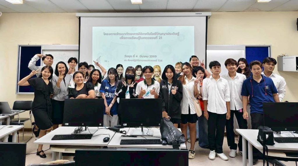 วันพุธที่ 4 มีนาคม 2569 อาจารย์วัชรี ปั้นนิยม ผู้ช่วยคณบดีคณะมนุษยศาสตร์และสังคมศาสตร์ พร้อมด้วยคณาจารย์กลุ่มวิชาพื้นฐาน (สาขาสารสนเทศศาสตร์และบรรณารักษศาสตร์) คณะมนุษยศาสตร์และสังคมศาสตร์ ได้จัดโครงการพัฒนาทักษะการใช้เทคโนโลยีปัญญาประดิษฐ์ ให้แก่นักศึกษา เพื่อเสริมสร้างความรู้ ความเข้าใจ และทักษะการประยุกต์ใช้เทคโนโลยีปัญญาประดิษฐ์ (AI) ในการเรียนรู้ การสืบค้นข้อมูล การวิเคราะห์ และการสร้างสรรค์ผลงานทางวิชาการอย่างมีประสิทธิภาพ ตลอดจนส่งเสริมให้นักศึกษามีความพร้อมในการปรับตัวต่อการเปลี่ยนแปลงของเทคโนโลยีในศตวรรษที่ 21 ณ ห้องปฏิบัติการคอมพิวเตอร์ 726 อาคารบัณฑิตศึกษา มหาวิทยาลัยราชภัฏราชนครินทร์