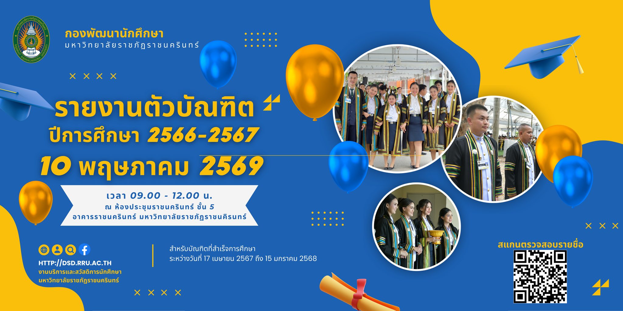 | ประกาศผลการคัดเลือกผู้ให้บริการตัดชุดครุยพร้อมเข็มวิทยฐานะบัณฑิต มหาบัณฑิต และดุษฎีบัณฑิต ในงานพิธีพระราชทานปริญญาบัตร ประจำปีการศึกษา 2564-2565 | รายละเอียด |